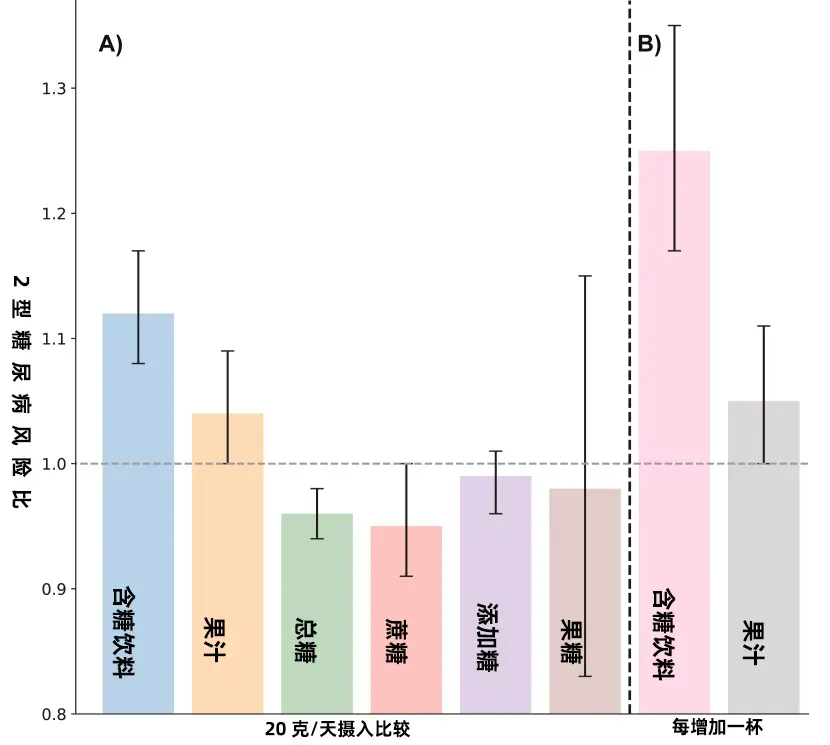 研究团队以20克糖为基准,统计了不同来源的糖对2型糖尿病的影响。(即便研究团队已经排除了体重指数、总热量摄入和其他生活方式因素的干扰,喝进去的糖带来的风险依然非常明显。)