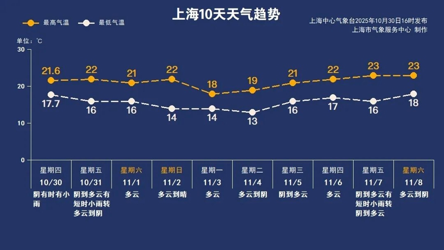 今天申城的天气就是“云里雾里”!最低温比昨天略高,市区徐家汇站17.7℃,郊区里崇明最凉,只有13.0℃,早晚出门穿薄外套刚好。受短波槽影响,上午基本是阴天,中午起飘起小雨,雨势虽弱,却刚好给最近的秋燥“降了温”,空气里没那么干了。气温也很平稳,全市最高普遍21~22℃,徐家汇站最高21.6℃,体感不冷不热,很舒服。