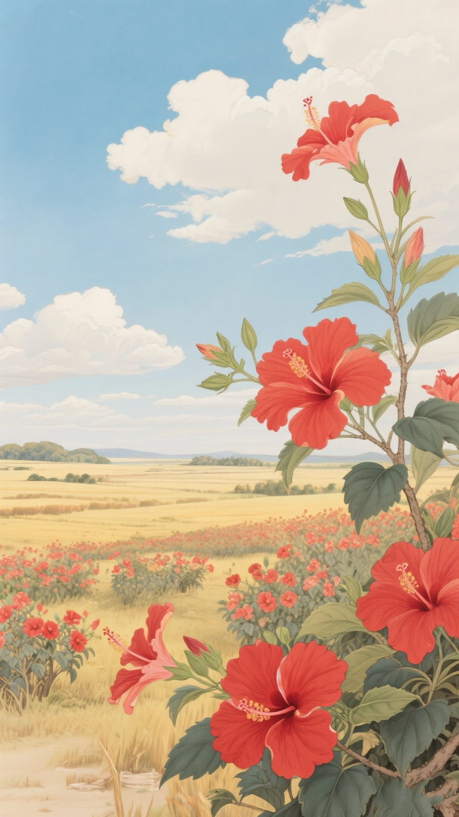 深秋时节,朱槿花期渐近尾声,却依然呈现出“朵朵烧云如海霞”的磅礴气象。“烧云”点出了朱槿花瓣饱满、温暖的质感,“海霞”则为其晕染开一片湿润而辽阔的背景。花色不再是园中独立的点缀,而是与特有的海天云霞连成一片,展现出一种蓬勃而坦荡的生命气象。