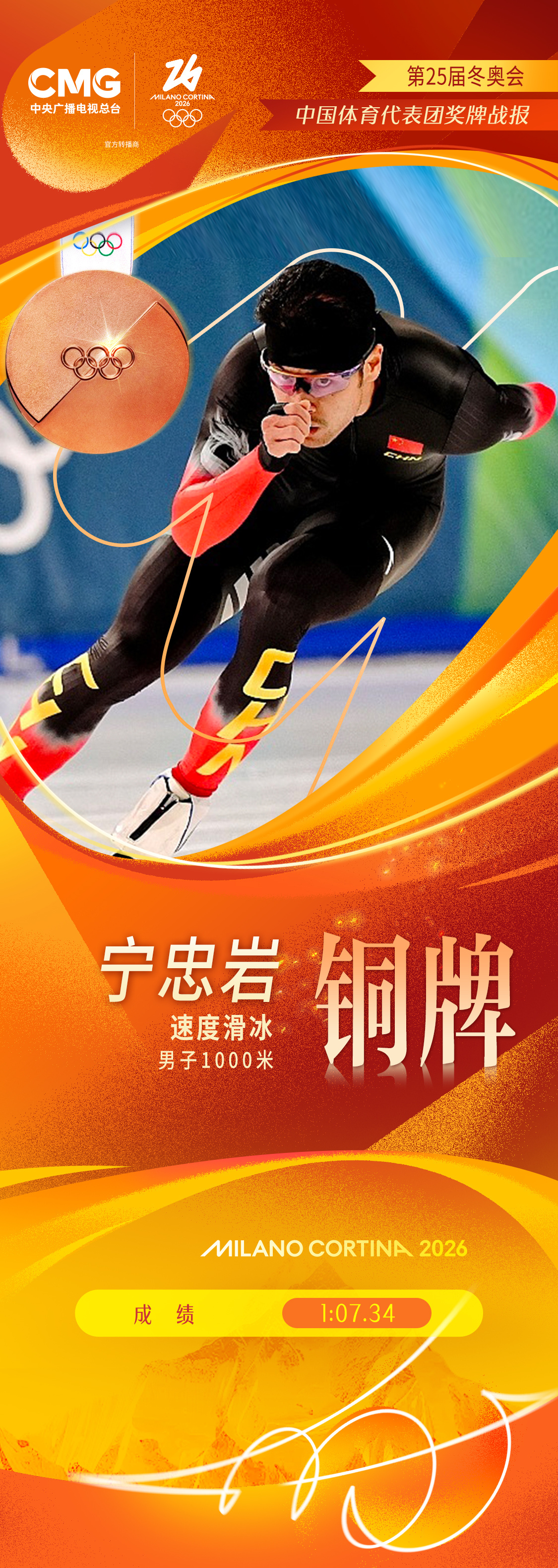 北京时间2月12日,米兰-科尔蒂纳冬奥会速度滑冰男子1000米决赛,中国选手宁忠岩发挥出色,以1分07秒34的成绩,获得铜牌。同时,他也刷新了中国选手在冬奥会中该项目的最好成绩。